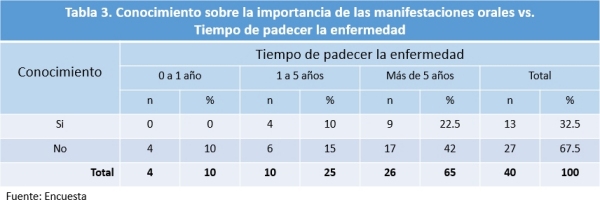 An autoimmune disease is characterized by the response generated by certain factors or environmental influences, develops an exaggerated response against the body itself can affect organs, present in up to 5% of the general population. Systemic Lupus Erythematosus (SLE) is a chronic autoimmune disorder characterized by a general commitment of the body, affects the skin, joints, kidneys, brain, among others. Its prevalence in the general population is 40 to 50 cases per 100,000 people, with female preponderance (female-male 9:1). Among its signs and symptoms are the oral condition in up to 50% of patients, therefore, the relationship between doctor - dentist is essential for the proper management of the oral manifestations. The objective of the study was to analyze knowledge about oral care in patients with SLE and identify associated oral manifestations. A descriptive cross-sectional study where a survey was applied to patients with SLE Lupus Association Nuevo Leon and Red Butterfly was performed B.C. (n = 40), to identify the time of developing the disease, presence of oral manifestations associated with the presence of SLE and information about their oral care. It was found that 95% of patients were female, 65% reported having more than 5 years of developing the disease, 87.5% presented oral manifestations associated with SLE and 67.5% were unaware of the importance of regular visits to the dentist and only 5% they had dental information to improve your oral condition. There is lack of dissemination regarding prevention in oral health in patients with SLE impacting the increase in oral diseases.
