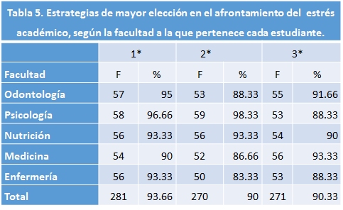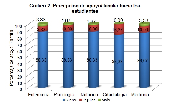 Psychosocial stress is a factor that is related to the onset of disease, where students are vulnerable. Academic stress, is defined as the impact that the situational environment the student, being generators of stress, the various characteristics of their academic activities and can cause adverse health outcomes, welfare and / or academic performance. The aim of the study was to identify the perception of stress in students the medical area of the faculties of Nursing, Public Health and Nutrition, Dentistry, Medicine and Psychology at the Autonomous University of Nuevo Leon, as well as the factors that generate and impact academic performance, emphasizing coping strategies as a result of social support received. A descriptive, transversal, prospective, comparative and observational study approved by the Bioethics Committee of the Faculty of Dentistry (SPSI-010 613, page 0096) was performed. The sample was composed of 300 students, distributed in 60 participants from each faculty, chosen at random for convenience. a compound of 56 reagents Likert scale for the variables to study instrument was applied. Students of the School of Nursing showed a greater perception of stress 80%, the School of Psychology showed the percentage of lower value 33.33%. Stressors were related to academic performance; the lack of clarity to receive instructions by teachers 88%, when teachers assume that students have knowledge that has not yet acquired 81.66% and when the results of their tests do not reflect the work and preparation that have developed 83.33%. Having a positive attitude, seek advice and help, prioritize tasks, key situations were selected to cope with stress. It was possible to conclude that coping with stress is significantly influenced by the support of the social environment of students.