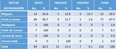 de 114 piezas tratadas endodónticamente equivalente a 207 raíces.