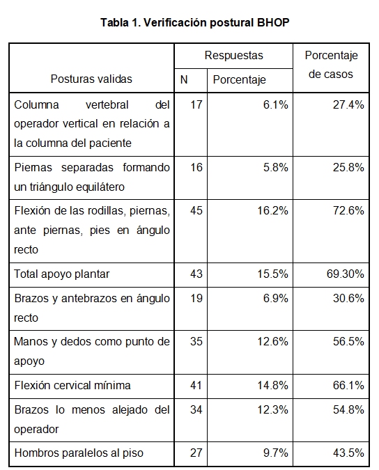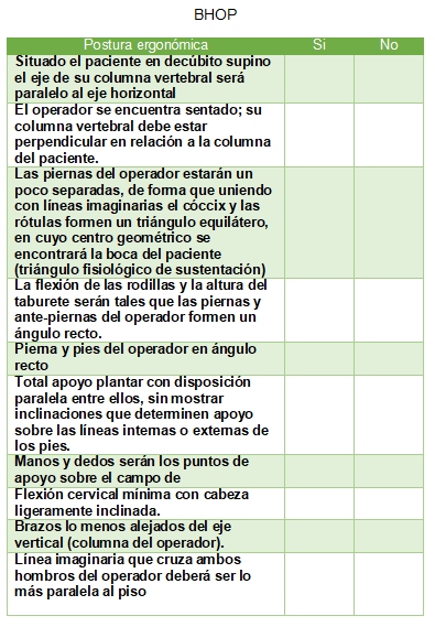 Methods: A quantitative, descriptive, observational study was carried out with a sample of 62 students from the University of Montemorelos of the career of Dental Surgeon between 19 and 35 years of age, who were evaluated using the Kuorinka Nordic questionnaire for Pain symptoms, BHOP postural checklist, and the RULA method To evaluate the postures. Statistical analysis was performed using SPSS predictive analytics software.
